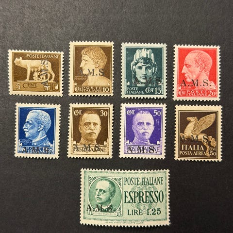 Italialaisia merkkejä 84kpl erilaisilla päällepainamilla. Osa ainakin 1900-luvun alkupuolelta. Monissa on ollut liimakkeet, mutta merkit ovat siistejä. Sekä leimattuja että käyttämättömiä. Katso kuvista tarkemmin
