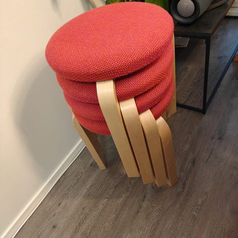 Jaloissa pientä käytön jälkeä. Istuinosa kuin uusi. Jakkarassa ei ole koskaan istuttu vaan se on ollut vain koristeena. Ostettu vuonna 2008 Espoossa olleesta Artekin myymälästä.