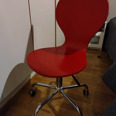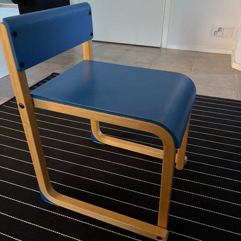 Vähän käytössä ollut juniorituoli. Hyvässä kunnossa, muutama naarmu jaloissa. Hieman teipinjälkiä selkänojassa voi vielä olla omatoimisen majanrakentajan jäljiltä.