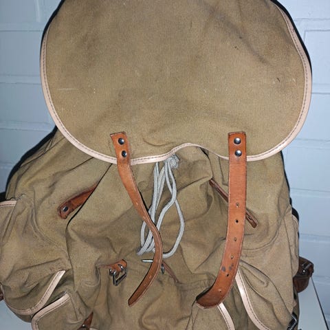 Tukevaa tekoa oleva lisätasku N. 13 x 25 x 5 cm, kaksi osastoa ja oma sadesuojuskin, ommeltu cordurasta, koristeena 90luvun karhunkierros merkki.