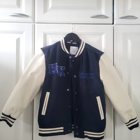 Hyvin vähän käytetty tummansini-valkea H&M baseball takki. Toisen hihan resorissa pieni haalea läiskä, ei juuri näy kuin ihan läheltä.