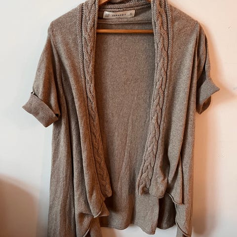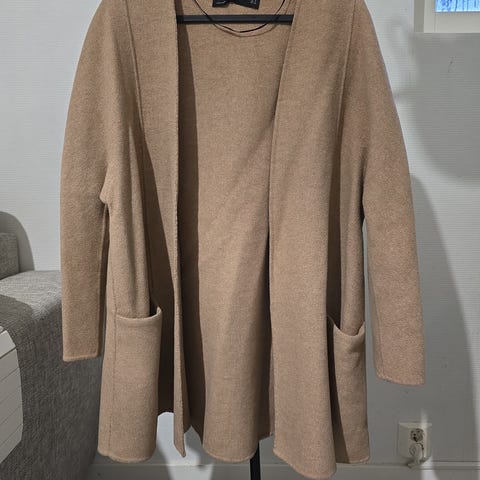 Zara neuletakki koko L mutta mielestäni vastaa pienempää kokoa, sopii paremmin S-M. Pientä nyppyä pinnassa ja muutama haalea tahra jos katsoo tarkkaan. 100% villaa