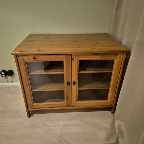 Siistikuntoinen valkoinen Ikean TV-taso / senkki / kaapisto / kaappi neljällä huurtelasiovellisella kaapilla. Jokaisessa kaapissa lasihyllyt.
