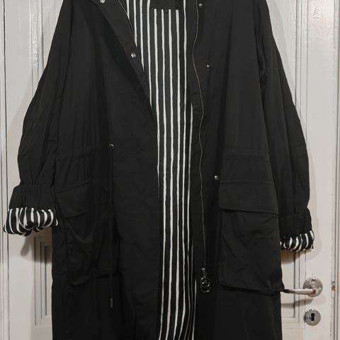 Marimekon trenssi koossa 38. Takista puuttuu alkuperäinen vyö, jonka tilalle edellinen omistaja on teettänyt vastaavan mutta hiukan erisävyisen vyön.