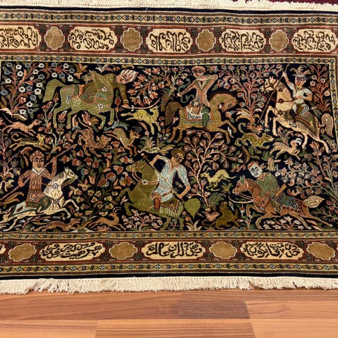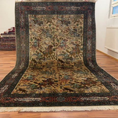 Käsinsolmittu Kashmir-silkki matto on todellinen taideteos, joka hurmaa eleganssillaan ja hienolla käsityöllään. Mallina on Qom-perinteestä tunnettu persialainen Qum-tyyli, ja matto heijastaa tämän klassisen kudontatavan ominaispiirteitä. Koko matto on täynnä yksityiskohtaisia kuvioita, ja sen sisäkkäisistä ornamenteista löytyy myös lukuisia eläinfiguureja, jotka on toteutettu suurella mestaruudella. Visuaaliselta vaikutelmaltaan matto muistuttaa lähes Pablo Picasson maalausta – niin vaikuttava se on.