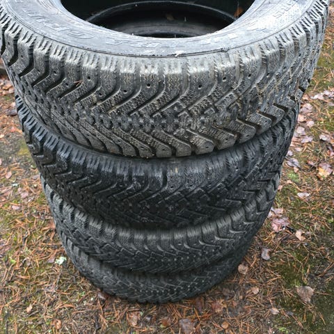 Vanhat Continentalin nastat joista kaikki nastat poikki. Jämät pois nyppimällä vielä kesäkäyttöön. Ei murtumajälkiä. Pintaa 4-5mm. DOT3514