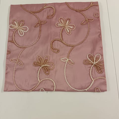 Vaalen punaiset+norsunluun väriset sisustustyynyn päälliset. Musta ruskea koristelu. Hieman kiiltävää materiaalia, vetoketjulla varustettu.