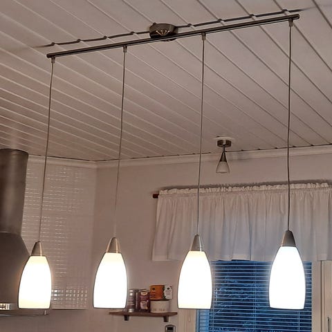 Roikkuu nyt n. 1m katosta. Säädettävissä.