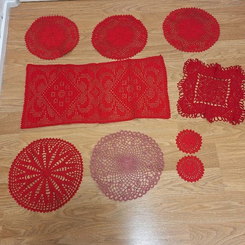 Käsin virkattua pitsiä, sisältää useita erikokoisia ja erimuotoisia pitsikaistaleita. Ennen vanhaa pyyhkeiden reunaan ommeltuja tai pieniin ikkunoihin kaitaverhon tavoin. Soveltuu kodin sisustukseen eri vuodenaikoina.