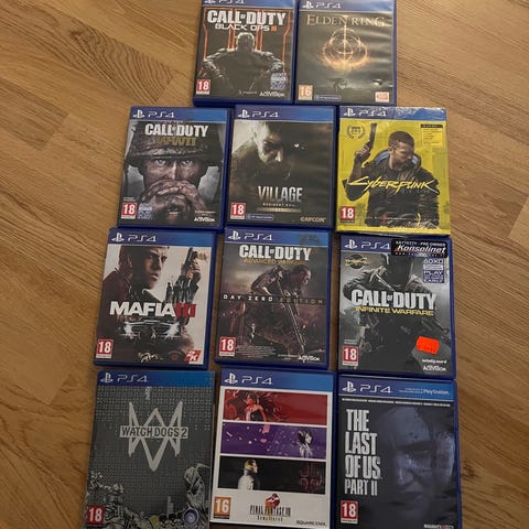 Playstation 4 -pelikokoelma, joka sisältää useita eri pelejä. Pelit ovat fyysisissä koteloissa, eri genrejä ja teemoja. Sopii Playstation 4 -pelikonsolille ja ps5 pelejä myös voi ostaa erikeseen eli ei koko pakkausta voi hintaa tulla tarjoaamaan
