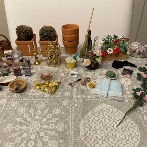 Myyn ystäväni äidin, joka on lopettanut nukkekotiharratuksen, loput 1:12 koon nukkekotitarvikkeet setteinä -> katso kaikki myytävät. Huonekalut muuten puuta, mutta pienet tuolit muovia. Ne myös pienempää kokoa. Takan paperin vasemmassa alakulmassa kulumaa. Yhdistelen postikuluja.