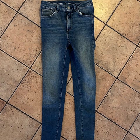 S koon tumman siniset farkut, jotka joustavat. Uudet, vain laput irroitettu.