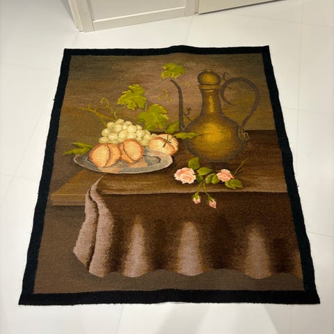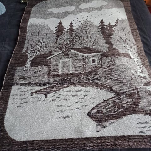 Kaunis, hyvä, ehjä ja siisti Kiinasta itse tuotu seinävaate. Etupuolen kuviointi silkkikangasta. Takakangas turkoosia samettikangasta.