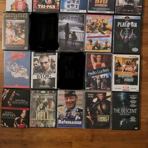 Myydään tämä koko satsi dvd-elokuvat ja cd:t yhdessä, en myy erikseen. Sisältää Kummeli, Salatut elämät, Uuno, Serranon perhe, Mr. & Mrs. Smith, Valamiehet, Dirty dancing, Forrest Gump, Tosinuija & vielä nuijempi, Pomon päiväkirja, Bandidas, DOA dead or alive, Mindhunters, Danny the dog, Katyn, Panttivanki ja cd:t Olli Leppänen, Machine men ja Neon 2. Kuvasta poiketen Suomirokkia 5 ei ollutkaan levyä ollenkaan ja keltaisesta Kummelista puuttuu yksi levy (näissä kaikissa Kummeleissa on yhdessä kaksi levyä) ja yhdestä Salatut elämät puuttuu yksi levy (yhdessä on kolme levyä). Nouto Tampereen ja Kangasalan rajalta.