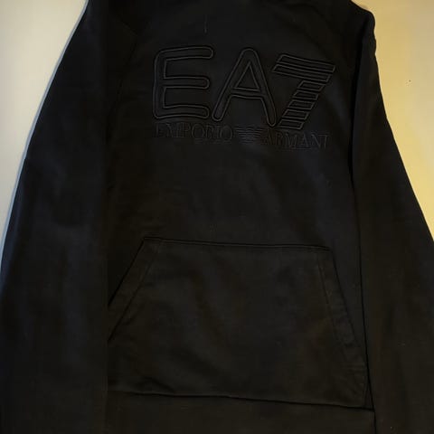 Armani M-kokoinen musta huppari, valmistettu puuvillasta. Hupparissa on keltainen painatus ja se on suunniteltu miehille.