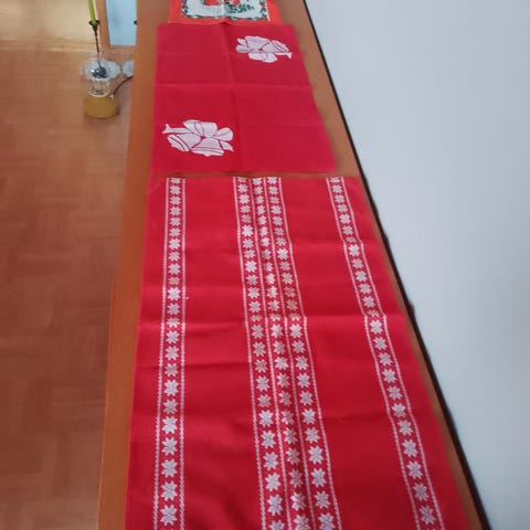 Reunoja kiertää kapea pitsi (n. 0,5 cm), punaisessa puuvilla kankaassa kirjailtu joulukello, havuja, kaksi kukkaa ja koruommelta. Kunto uudenveroinen, sillä liinoja on käytetty hyvin vähän. Hinta molemmilta € 5, yksi liina € 2,50. Nouto tai postitus kirjeenä yhdellä postimerkillä, € 2,75. Maksu käteisellä tai tilille. Huom minulla ei ole Mobile Payta enkä voi lähettää liinoja Toridiilillä.