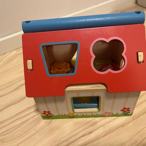 Kehittävät palikkalelu lapselle, jossa pudotetaan eläinhahmoja ja eri muotoja mökkiin ja avaimella avataan.