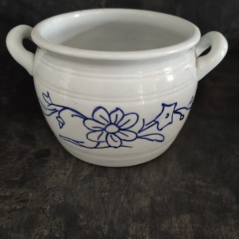 Pytty on nähnyt elämää, eikä ole täydellinen, kuten kuvasta näkyy. Toiselta puolelta pytty on ehjä. Korkeus 13 cm ja suun halkaisija 16,5 cm ja paino 1 kilo. Myynnissä myös ehjä voipytty. Nouto Tampereen keskustasta.