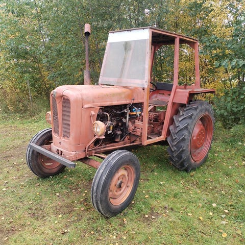 Tosimiehen traktori käy ja liikkuu ei tehostinta vaatii hauista, hyvin ilmastoitu hytti, sähköissä puutteita, hinta sis. alv, ml 5500