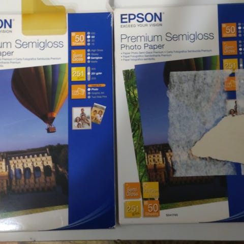 4 erilaista paperipakettia, joista avattu on vain keskellä oleva Epson-pakkaus (siinä jäljellä vielä 27 tulostuspaperia).