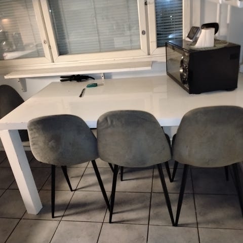 Valkoinen kiiltävä iskun ruokapöytä ja vitra eames dsw tyyliset tuolit - järkeviä tarjouksia saa esittää! 😊 (jakkara ei kuulu kauppaan)