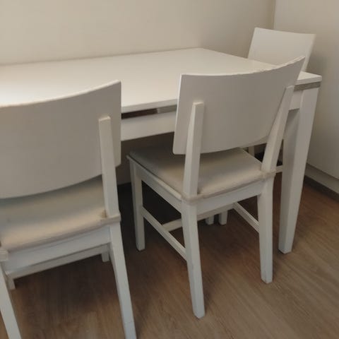 Käytön jälkiä näkyy, mutta nämä voi tarvittaessa tarkistaa ennen ostopäätöstä. Sovitusti myynnissä myös erikseen, 100€ pöytä ja 200€ tuolit 4kpl.