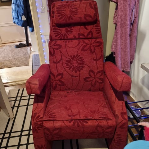 Punainen tuoli, jossa kangasverhoilu ja puukäsinojat. Auttaa pääsemään helpommin ylös tuolista. Kun painaa käsibojia alas "peppuosa" tuolista nousee ylös.