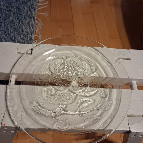 - Nuutajärven Lasin valmistama Pioni-sarjan matala tarjoilu- / koristelautanen