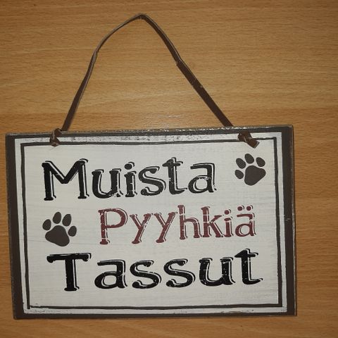 Uusi puinen kyltti. Metalliketju ripustin. Koko 24x7x1,5cm. Sisä- ja ulkokäyttöön.