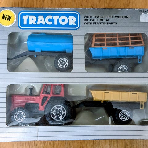 Puusepän tekemä täyspuinen traktori, jossa pyörät pyörii, perälavan voi kipata ja irrottaa erikseen. Kokonaisuuden pituus 44 cm, leveys 13 cm ja korkeus 13 cm. Myynnissä myös puinen kuorma- auto.