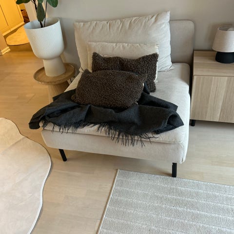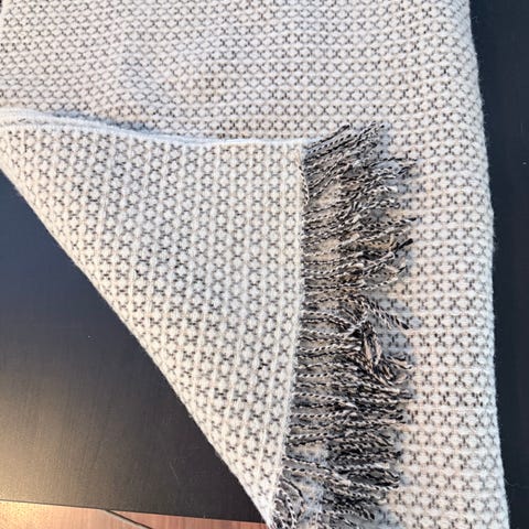 100% villaa. Tuolin päällä levännyt. Koko 130x170cm. Ei pesun tarvetta. Pesuohje: käsinpesu tai hellävarainen villapesu koneessa..