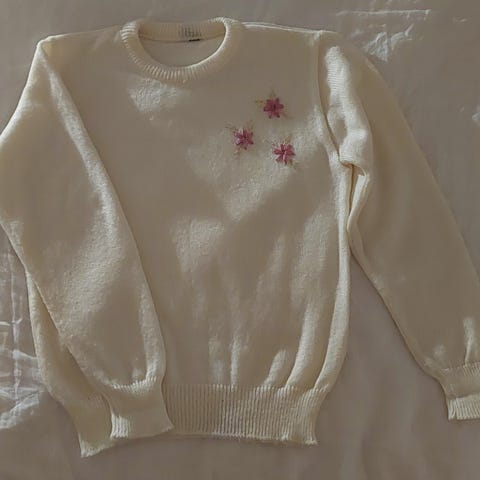 Siisti, luonnonvalkoinen, pitkä neule. Sivuilla halkiot.