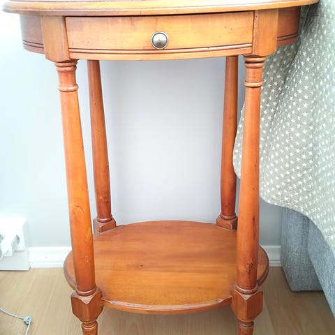 Vähäiseen käyttöön jäänyt. Ennen sisällä ja vuoden ulkona. Pintahoidolla saa hyvän apupöydän tästä, tai maalaa oman väriseksi. Ehjä, vakaa ja pyörät pyörii.