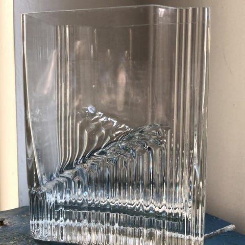 Harmaa lasimaljakko, jossa on halkaisijaltaan 6,5 cm kapea suu ja 24 cm leveä runko, korkeus 20 cm. Maljakossa näkyy sävyeroja ja halkeilukuviointi pinnassa, joka on osa sen ulkonäköä. Pinnassa myös pieniä kiviä, koska maljakko valettu hiekkaan. Kierrätyslasia. Espanjassa tehty. Ei voi lähettää, kuljetus lähialueelle mahdollinen, lisätietoja profiilissa.