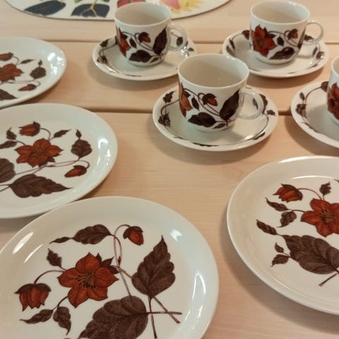 Arabia Tea for Two kupit ja lautaset, joissa on ruskean sävyinen kukkakuvio. Sarja sisältää kupit ja niille sopivat lautaset. Valmistettu keraamisesta materiaalista.