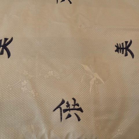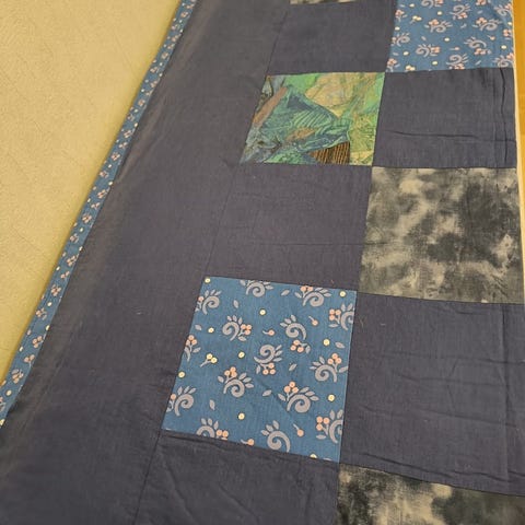 Puuvillakankaista ommeltu sängynpeitto. Välissä ohut vanu ja taustana valkaisematon lakanakangas puuvillaa. Koko 140cm x 275cm.