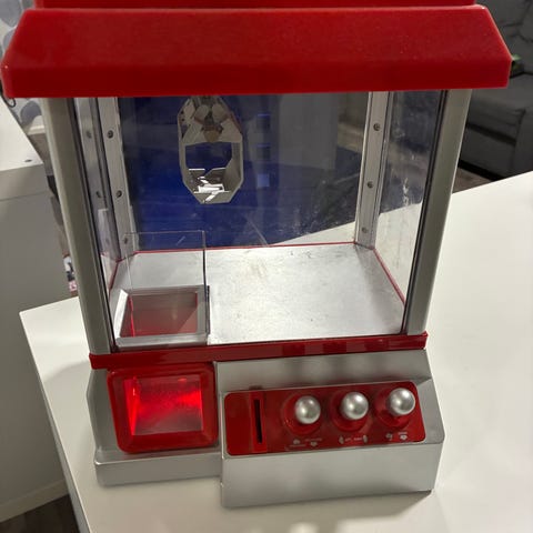 Melissa-merkkinen karkkiautomaatti. Pitäisi tipautella karkkeja, mutta käynnistysnappilassa on joku kosketushäiriö. Yskähtää välillä, mutta hyytyy sitten. Virtajohto on kadonnut