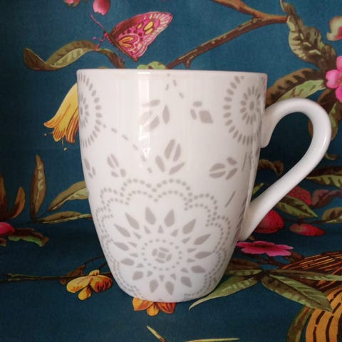 Muki, harmaa ananaskuvio, koko: halkaisija 11 cm, korkeus 11 cm.