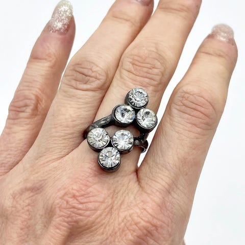 Tyylikäs ja näyttävä teräksinen sormus, jonka pyöreä laatta on kauttaaltaan kirkkaiden strassikivien koristama. Kestävä ja helppohoitoinen STEEL-materiaali. Hyvässä kunnossa, käytetty vain vähän. Sopii arkeen ja juhlaan tuomaan ripauksen kimallusta.