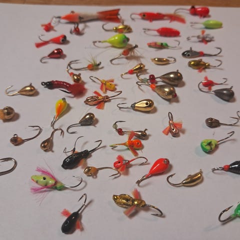 #12 koukkuihin-, pari jigi koukkuun tehtyä. Muutamassa on tommonen isompi hile niskassa mikä välähtää mukavasti pilkkireiän alla.