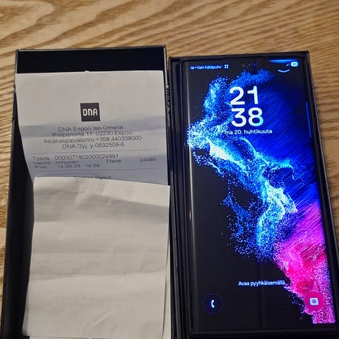 Myydään Samsung Galaxy S22 Ultra älypuhelin, jossa on 512 GB tallennustilaa. Tarkka malli SM-S908B/DS. Puhelimeen on vaihdettu valtuutetussa huollossa 15.8.2025 uusi näyttö ja akku (maksoi 391,13€). Näytön vaihdon yhteydessä tuli uusi runko eli puhelin on tosi siisti.