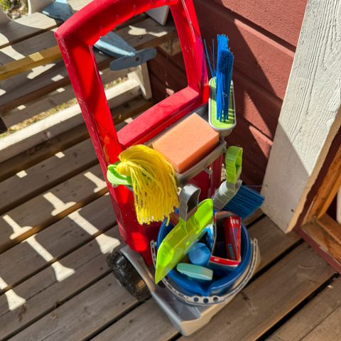 Leikkiostoskärryt. Kädensijan pehmuste revennyt, muuten hyvässä kunnossa seuraavalle leikkijälle.