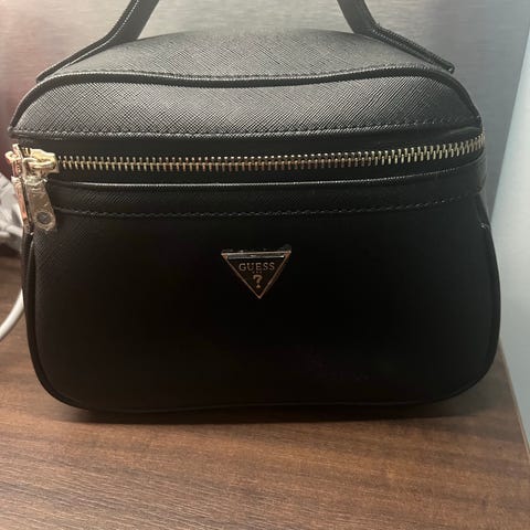 Uuden veroinen tarrakiinnitteinen laukku avautuu pöydälle, josta paljastuu pieni peili sekä irrotettava pussukka vetoketjulla, verkkotasku vetoketjulla sekä kaksi kiinteää säilytys osaa, joissa myös vetoketjut. Helppo ripustaa läpän rengasaukosta naulakkoon avoimena ollessa.