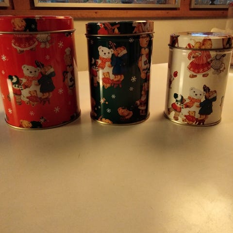 Kolme jouluaiheista metalli säilytyspurkkia.Eri kokoisia ja menevät sisäkkäin.Hp.4€