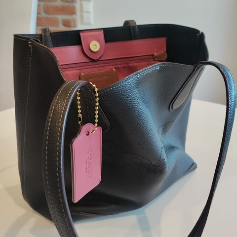 Kaunis kerman värinen Coach-laukku, joka on uuden veroinen. Edessä on yksi tasku ja sisäpuolella kaksi taskua, joista toinen on vetoketjulla suljettava. Hihnan pituutta pystyy säätämään. Metalliosat on kullan väriset. Laukku on siro mutta kuitenkin tilava. Mitat noin 16x21,5x8 cm