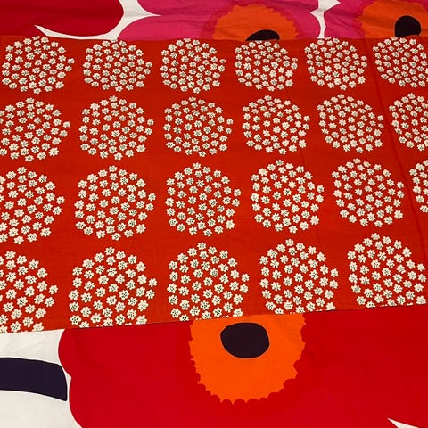 Marimekko kappa, joka on n. 136 cm pitkä, 67 cm korkea ja tankokuja n. 6 cm. Siististi ommeltu ja ollut kaapissa käyttämättömänä. Ei toridiiliä ja Matkahuollon paketilla 5.90 euroa lähetys.