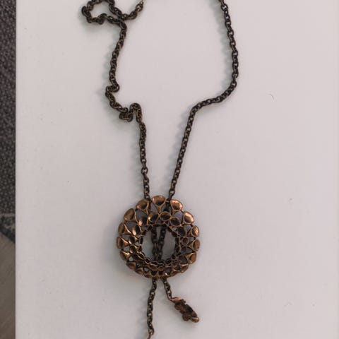 Hannu Ikosen pronssista tehty voikukka kaulakoru. Ketjun pituus 60cm. Kunto on hyvä, pientä putsausta vain vailla.