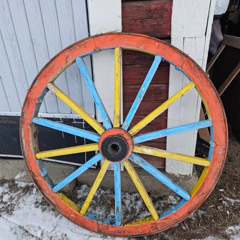 Pihalla ollut ja kuvissa märkä kärrynpyörä. Yhdestä kohtaa hieman rikkoontumaa.