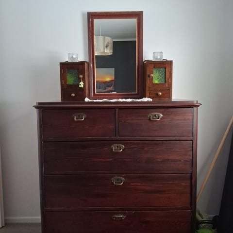 Antiikkinen puinen lipasto kahdella laatikolla ja ovella