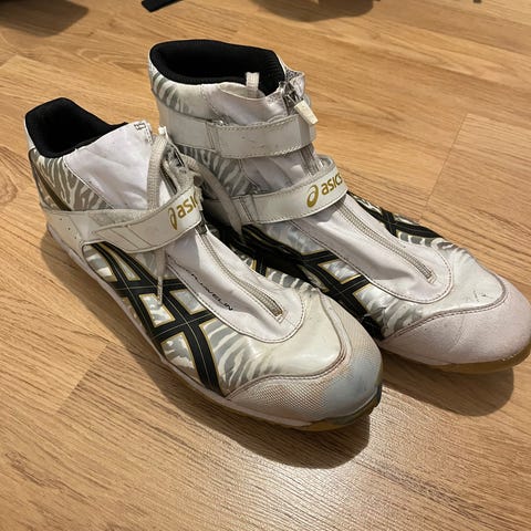 Adidas keihäspiikkarit. Koko 46, itsellä kuitenkin esim. Asics menee koossa 44. Nämä mielestäni pientä kokoa, riippuu toki jalasta.